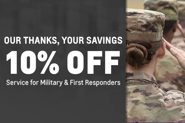 Plus tax and applicable fees. Valid for military members and first responders with proper identification. May not be combined with other offers. Must present coupon at time of service write-up. See dealer for details.