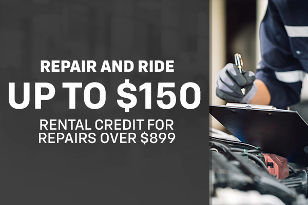 Plus tax and applicable fees. Rental credit applied toward on-site rental with qualifying repair subtotal over $899 before tax; maximum credit $150. Subject to availability and rental policies including valid driver’s license and insurance. May not be combined with other offers. Must present coupon at time of service. See dealer for details. Offer Expires 04/30/2026.