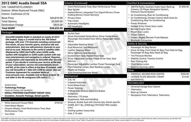Clean CARFAX. Priced below KBB Fair Purchase Price! White Diamond Tricoat 2012 GMC Acadia Denali FWD 6-Speed Automatic Electronic with Overdrive 3.6L V6 SIDI 10 Speakers, 2-Position Memory For Driver's Seat Adjuster, 20 Chrome-Clad Aluminum Wheels, 3.16 Axle Ratio, 3rd row seats: split-bench, 4-Way Power Passenger Seat, 4-Wheel Disc Brakes, 5-Gauge Instrumentation, 7-Passenger Seating (2-2-3 Seating Configuration), 8-Way Power Driver Seat, ABS brakes, Air Conditioning, Alloy wheels, AM/FM radio: SiriusXM, AM/FM Stereo w/CD Player/MP3 Playback, AM/FM Stereo w/CD/MP3 Playback/Navigation, Auto-dimming door mirrors, Auto-dimming Rear-View mirror, Automatic temperature control, Bluetooth® For Phone, Body-Color Moldings w/Chrome Insert, Bodyside moldings, Bose Premium 10-Speaker Audio System, Brake assist, Bumpers: body-color, CD player, Compass, Delay-off headlights, Denali Specific Acoustic Insulation Package, Denali Specific Body-Color Rocker Molding, Denali Specific Double Dual Exhaust w/Chrome Tips, Denali Specific Front & Rear Body-Color Fascias, Denali Specific Illuminated Sill Plate, Digital Compass Display, Driver door bin, Driver vanity mirror, Dual front impact airbags, Dual front side impact airbags, Dual SkyScape 2-Panel Power Sunroof, Electronic Stability Control, Emergency communication system: OnStar Directions & Connections, Exterior Parking Camera Rear, Four wheel independent suspension, Front & Rear Body-Color Wheel Flares, Front anti-roll bar, Front Bucket Seats, Front Center Armrest w/Storage, Front dual zone A/C, Front fog lights, Front License Plate Bracket, Front reading lights, Fully automatic headlights, Garage door transmitter, Genuine wood console insert, Genuine wood dashboard insert, Genuine wood door panel insert, Head-Up Display, Heads-Up Display, Heated & Cooled Front Seats, Heated door mirrors, Heated front seats, Heated Power-Adjustable Outside Mirrors, Heavy-Duty Cooling System, High-Intensity Discharge Headlights, High-Intensity Discharge Projector Low Beam Headlamps, Illuminated entry, Inside Rear-View Auto-Dimming Mirror, Integral Spotter Blind-Zone Mirrors, Leather Shift Knob, Leather steering wheel, Leather-Wrapped Steering Wheel w/Wood Trim, Low tire pressure warning, Memory seat, NavTraffic, Occupant sensing airbag, Outside temperature display, Overhead airbag, Overhead console, Panic alarm, Passenger door bin, Passenger vanity mirror, Perforated Leather Seating Surfaces Seat Trim, Power door mirrors, Power driver seat, Power Liftgate, Power moonroof, Power passenger seat, Power Rear Liftgate Body, Power steering, Power windows, Power Windows w/Driver Express-Up & -Down, Preferred Equipment Group 5SA, Premium Carpeted Front 2nd & 3rd Row Floor Mats, Radio data system, Rear air conditioning, Rear anti-roll bar, Rear audio controls, Rear Audio System Controls, Rear Cargo Area Audio System Controls, Rear Park Assist, Rear reading lights, Rear Vision Camera, Rear window defroster, Rear window wiper, Reclining Bucket Seats, Remote keyless entry, Remote Vehicle Start, Ride & Handling Suspension, Roof rack: rails only, Second Row Center Console, Security system, SIRIUSXM Satellite Radio, Speed control, Speed-sensing steering, Spoiler, Steering wheel mounted audio controls, Tachometer, Technology Package, Telescoping steering wheel, Tilt steering wheel, Traction control, Trailer Hitch, Trailering Equipment, Tri-Zone Automatic Climate Control, Trip computer, Turn signal indicator mirrors, Universal Home Remote, USB Port-Receptacle, Variable Effort Power Steering, Variably intermittent wipers, Ventilated front seats, Voltmeter.