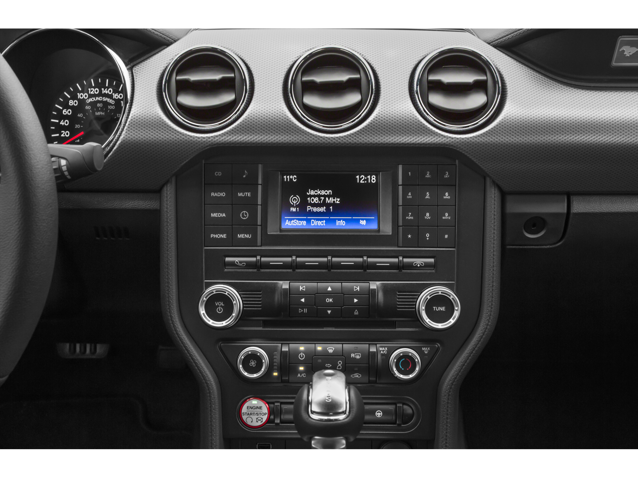 The Mustang's interior is equally impressive, with unique leather seating surfaces that exude a sense of refinement. The exterior parking camera rear provides added peace of mind, while the premium audio system and steering wheel-mounted controls ensure you can enjoy your favorite tunes on the go.