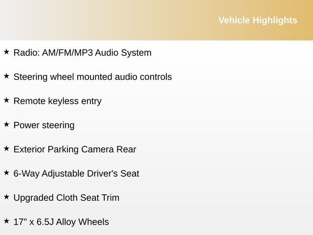- Radio: AM/FM/MP3 Audio System -inc: SiriusXM satellite radio w/3-month complimentary subscription, Bluetooth® wireless technology w/steering wheel-mounted controls, USB/auxiliary input jacks, and 6 speakers