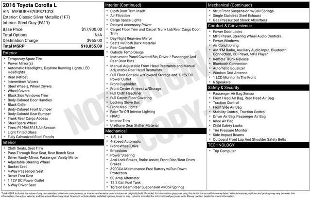 15 x 6.0 Steel Wheels, 6 Speakers, ABS brakes, Air Conditioning, AM/FM radio, Brake assist, Bumpers: body-color, CD player, Delay-off headlights, Driver door bin, Driver vanity mirror, Dual front impact airbags, Dual front side impact airbags, Electronic Stability Control, Fabric Seat Trim, Front anti-roll bar, Front Bucket Seats, Front Center Armrest w/Storage, Front reading lights, Front wheel independent suspension, Illuminated entry, Knee airbag, Low tire pressure warning, Occupant sensing airbag, Outside temperature display, Overhead airbag, Passenger door bin, Passenger vanity mirror, Power door mirrors, Power steering, Power windows, Radio data system, Radio: AM/FM/CD Player w/6.1 Touch Screen, Rear anti-roll bar, Rear window defroster, Speed-sensing steering, Split folding rear seat, Steering wheel mounted audio controls, Tachometer, Telescoping steering wheel, Tilt steering wheel, Traction control, Trip computer.