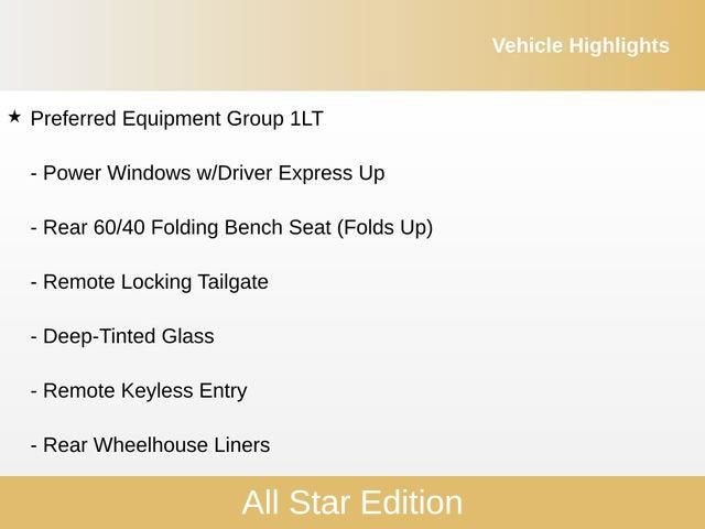 - Seats, front 40/20/40 split-bench, 3-passenger, available in cloth or leather includes driver and front passenger recline with outboard head restraints and center fold-down armrest with storage. Also includes manually adjustable driver lumbar, lockable storage compartment in seat cushion, and storage pockets. (Leather with (KA1) heated seat cushions and seat backs is an available extra charge option with (H1Y) Jet Black leather appointed interior trim and requires (PCM) LT Convenience Package, (PDA) Texas Edition or (PDU) All Star Edition. (Leather with (KA1) heated seat cushions and seat backs is an available extra charge option with (H1Y) Jet Black leather appointed interior trim and requires (PCY) LT Fleet Convenience Package, (PDA) Texas Edition or (PDU) All Star Edition. Includes (AG1) driver 10-way power seat-adjuster with (PCM) LT Convenience Package, (PDA) Texas Edition or (PDU) All Star Edition.) Includes (AG1) driver 10-way power seat-adjuster with (PCY) LT Fleet Convenience Package, (PDA) Texas Edition or (PDU) All Star Edition.)