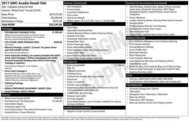 White Frost Tricoat 2017 GMC Acadia Denali AWD 6-Speed Automatic 3.6L V6 SIDI DOHC VVT 3.16 Axle Ratio, 3rd Row All-Weather Floor Liner (LPO), 3rd row seats: split-bench, 4-Wheel Disc Brakes, 6-Passenger (2-2-2 Seating Configuration), 7-Passenger (2-3-2 Seating Configuration), 8 Speakers, ABS brakes, Air Conditioning, All-Weather Floor Liner (LPO), Alloy wheels, AM/FM radio: SiriusXM, Apple CarPlay/Android Auto, Auto High-beam Headlights, Auto-dimming door mirrors, Auto-dimming Rear-View mirror, Automatic temperature control, Brake assist, Bumpers: body-color, Chassis Continuously Variable Real Time Damping, Compass, Delay-off headlights, Driver door bin, Driver vanity mirror, Dual front impact airbags, Dual front side impact airbags, Dual SkyScape 2-Panel Power Sunroof, Electronic Cruise Control w/Set & Resume Speed, Electronic Stability Control, Emergency communication system: OnStar Guidance, Exterior Parking Camera Rear, Floor Liner Package (LPO), Forward Automatic Braking, Four wheel independent suspension, Front anti-roll bar, Front Bucket Seats, Front Center Armrest, Front dual zone A/C, Front fog lights, Front reading lights, Full Speed Adaptive Cruise Control w/Stop/Go, Fully automatic headlights, Garage door transmitter, Heated door mirrors, Heated front seats, Heated rear seats, Heated steering wheel, High-Intensity Discharge Headlights, Illuminated entry, Knee airbag, Low tire pressure warning, Memory seat, Navigation System, Occupant sensing airbag, Outside temperature display, Overhead airbag, Overhead console, Panic alarm, Passenger door bin, Passenger vanity mirror, Perforated Leather-Appointed Seat Trim, Performance Ride & Handling Suspension, Power door mirrors, Power driver seat, Power Liftgate, Power passenger seat, Power steering, Power windows, Preferred Equipment Group 5SA, Premium audio system: IntelliLink, Radio data system, Radio: AM/FM 8 Diagonal Color Touch Navigation, Rear air conditioning, Rear anti-roll bar, Rear reading lights, Rear window defroster, Rear window wiper, Remote keyless entry, Roof rack: rails only, Security system, SiriusXM Satellite Radio, Speed control, Speed-sensing steering, Spoiler, Steering wheel mounted audio controls, Surround Vision System, Tachometer, Technology Package, Telescoping steering wheel, Tilt steering wheel, Traction control, Trip computer, Variably intermittent wipers, Ventilated front seats, Voltmeter, Wheels: 20 x 8 Polished Aluminum (4).