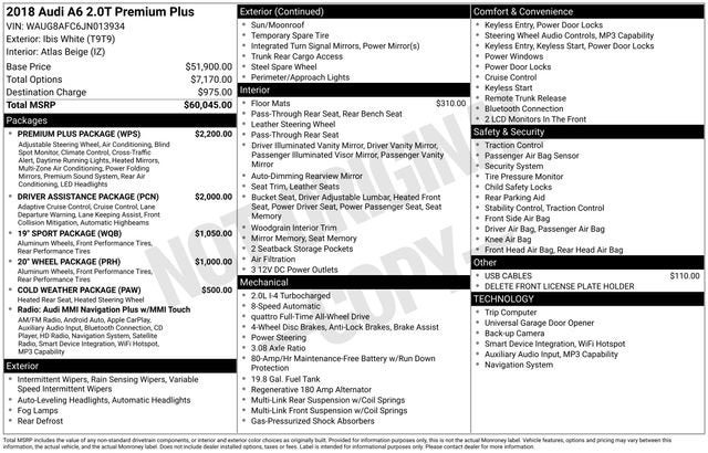10 Speakers, AM/FM radio: SiriusXM, Audi Connect w/Online Services, Audi Sound System, Four wheel independent suspension, Heated Front Seats, Leather Seating Surfaces, Navigation System, Power door mirrors, Power driver seat, Power passenger seat, Radio: Audi MMI Navigation Plus w/MMI Touch, Remote keyless entry, Speed-sensing steering, Steering wheel mounted audio controls, USB Audi Music Interface, Wheels: 18 10-V-Spoke-Design, 4-Wheel Disc Brakes, ABS brakes, Air Conditioning, Alloy wheels, Anti-whiplash front head restraints, Auto-dimming door mirrors, Auto-dimming Rear-View mirror, Automatic temperature control, Brake assist, Bumpers: body-color, CD player, Compass, Delay-off headlights, Driver door bin, Driver vanity mirror, Dual front impact airbags, Dual front side impact airbags, Electronic Stability Control, Exterior Parking Camera Rear, Front anti-roll bar, Front Bucket Seats, Front Center Armrest w/Storage, Front dual zone A/C, Front fog lights, Front reading lights, Garage door transmitter: HomeLink, Genuine wood console insert, Genuine wood dashboard insert, Genuine wood door panel insert, Heated door mirrors, Heated front seats, High intensity discharge headlights: Bi-xenon, HVAC memory, Illuminated entry, Knee airbag, Leather Shift Knob, Leather steering wheel, Low tire pressure warning, Memory seat, Occupant sensing airbag, Outside temperature display, Overhead airbag, Panic alarm, Passenger door bin, Passenger vanity mirror, Power moonroof, Power steering, Power windows, Radio data system, Rain sensing wipers, Rear air conditioning, Rear anti-roll bar, Rear fog lights, Rear reading lights, Rear seat center armrest, Rear window defroster, Security system, Speed control, Speed-Sensitive Wipers, Split folding rear seat, Tachometer, Telescoping steering wheel, Tilt steering wheel, Traction control, Trip computer, Turn signal indicator mirrors, Variably intermittent wipers, 10 Speakers, AM/FM radio: SiriusXM, Audi Connect w/Online Services, Audi Sound System, Four wheel independent suspension, Heated Front Seats, Leather Seating Surfaces, Navigation System, Power door mirrors, Power driver seat, Power passenger seat, Radio: Audi MMI Navigation Plus w/MMI Touch, Remote keyless entry, Speed-sensing steering, Steering wheel mounted audio controls, USB Audi Music Interface, Wheels: 18 10-V-Spoke-Design.