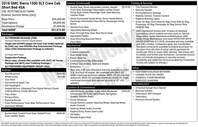 110-Volt AC Power Outlet, 150 Amp Alternator, 1st & 2nd Row Color-Keyed Carpeted Floor Mats, 20 x 9 Polished Aluminum Wheels, 4.2 Diagonal Color Display Driver Info Center, 6 Rectangular Chromed Tubular Assist Steps, Auto-Dimming Inside Rear-View Mirror, Auxiliary External Transmission Oil Cooler, Bose Speaker System, Chrome Bodyside Moldings, Chrome Door Handles, Chrome Mirror Caps, Color-Keyed Carpeting, Deep-Tinted Glass, Driver & Front Passenger Illuminated Vanity Mirrors, Dual-Zone Automatic Climate Control, Electric Rear-Window Defogger, EZ Lift & Lower Tailgate, GMC 4G LTE, Heavy-Duty Rear Locking Differential, Leather Wrapped Steering Wheel w/Cruise Controls, LED Cargo Box Lighting, LED Tailamps w/Signature, Manual Tilt/Telescoping Steering Column, OnStar & GMC Connected Services Capable, Power Adjustable Pedals, Power Folding & Adjustable Heated Outside Mirrors, Power Windows w/Driver Express Up & Down, Preferred Equipment Group 4SA, Rear 60/40 Folding Bench Seat (Folds Up), Rear Wheelhouse Liners, Remote Keyless Entry, Remote Vehicle Starter System, Single Slot CD/MP3 Player, SLT Premium Package, Steering Wheel Audio Controls, Theft Deterrent System (Unauthorized Entry), Thin Profile LED Fog Lamps, Trailering Equipment, Universal Home Remote, 10-Way Power Driver's Seat Adjuster, 4-Wheel Disc Brakes, 40/20/40 Front Split Bench Seat, 6 Speakers, 6-Speaker Audio System, ABS brakes, Adjustable pedals, Air Conditioning, Alloy wheels, AM/FM radio: SiriusXM, Auto-dimming door mirrors, Auto-dimming Rear-View mirror, Automatic temperature control, Bodyside moldings, Brake assist, Bumpers: chrome, CD player, Compass, Delay-off headlights, Driver door bin, Driver vanity mirror, Dual front impact airbags, Dual front side impact airbags, Electronic Stability Control, Exterior Parking Camera Rear, Floor Mounted Console, Front anti-roll bar, Front Center Armrest w/Storage, Front dual zone A/C, Front fog lights, Front Full Feature Power Reclining Bucket Seats, Front License Plate Kit, Front reading lights, Front wheel independent suspension, Fully automatic headlights, Garage door transmitter, GMC Connected Access, HD Radio, Heated & Ventilated Front Bucket Seats, Heated door mirrors, Heated Driver & Front Passenger Seats, Heated front seats, Heavy Duty Suspension, High-Intensity Discharge Headlights, Illuminated entry, Leather Appointed Seat Trim, Low tire pressure warning, Memory seat, Occupant sensing airbag, Outside temperature display, Overhead airbag, Overhead console, Panic alarm, Passenger door bin, Passenger vanity mirror, Power door mirrors, Power driver seat, Power passenger seat, Power steering, Power Sunroof, Power windows, Premium audio system: GMC Infotainment System, Radio data system, Radio: AM/FM/GMC Infotainment & Navigation, Radio: AM/FM/GMC Infotainment System, Rear reading lights, Rear seat center armrest, Rear step bumper, Rear window defroster, Remote keyless entry, Remote Locking Tailgate, Security system, SiriusXM Satellite Radio, Speed control, Speed-sensing steering, Split folding rear seat, Steering wheel mounted audio controls, Tachometer, Telescoping steering wheel, Tilt steering wheel, Traction control, Trip computer, Turn signal indicator mirrors, Variably intermittent wipers, Voltmeter, Wheel Locks (Set of 4) (LPO), Wheels: 18 x 8.5 Polished Aluminum, Wireless Charging, 110-Volt AC Power Outlet, 150 Amp Alternator, 1st & 2nd Row Color-Keyed Carpeted Floor Mats, 20 x 9 Polished Aluminum Wheels, 4.2 Diagonal Color Display Driver Info Center, 6 Rectangular Chromed Tubular Assist Steps, Auto-Dimming Inside Rear-View Mirror, Auxiliary External Transmission Oil Cooler, Bose Speaker System, Chrome Bodyside Moldings, Chrome Door Handles, Chrome Mirror Caps, Color-Keyed Carpeting, Deep-Tinted Glass, Driver & Front Passenger Illuminated Vanity Mirrors,