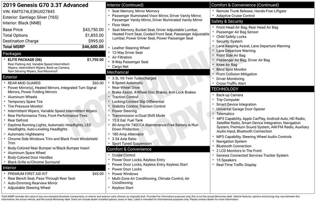 Silver 2019 Genesis G70 3.3T Advanced V6 8-Speed Automatic