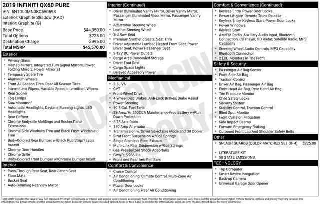 With its exceptional value, refined design, and comprehensive list of features, this 2019 INFINITI QX60 PURE is an exceptional choice for the discerning driver. Experience the difference for yourself by scheduling a test drive at our showroom today. We're confident you'll be impressed by the QX60's unparalleled combination of style, performance, and versatility.
