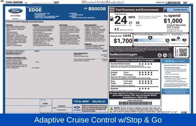 Oxford White 2020 Ford Edge SEL FWD 8-Speed Automatic EcoBoost 2.0L I4 GTDi DOHC Turbocharged VCT WE DELIVER ANYWHERE, 110V/150W AC Power Outlet, 3.80 Axle Ratio, 4-Wheel Disc Brakes, 9 Speakers, ABS brakes, ActiveX Seating Material Heated Bucket Seats, Adaptive Cruise Control w/Stop & Go, Air Conditioning, Alloy wheels, AM/FM radio: SiriusXM, Auto High-beam Headlights, Auto-dimming Rear-View mirror, Automatic temperature control, Brake assist, Bumpers: body-color, Compass, Delay-off headlights, Driver door bin, Driver vanity mirror, Dual front impact airbags, Dual front side impact airbags, Electronic Stability Control, Emergency communication system: SYNC 3 911 Assist, Evasive Steering Assist, Foot-Activated Hands-Free Liftgate, Ford Co-Pilot360 Assist+, FordPass Connect, Four wheel independent suspension, Front anti-roll bar, Front Bucket Seats, Front Center Armrest w/Storage, Front dual zone A/C, Front fog lights, Front reading lights, Fully automatic headlights, Heated door mirrors, Heated front seats, Illuminated entry, Knee airbag, Lane Centering, Low tire pressure warning, Occupant sensing airbag, Outside temperature display, Overhead airbag, Overhead console, Panic alarm, Passenger door bin, Passenger vanity mirror, Perimeter Alarm, Power door mirrors, Power driver seat, Power passenger seat, Power steering, Power windows, Premium 9 Speaker Audio System, Radio: AM/FM Stereo/MP3 Capable, Rain sensing wipers, Rear anti-roll bar, Rear reading lights, Rear seat center armrest, Rear window defroster, Rear window wiper, Remote keyless entry, Remote Start System, Roof rack: rails only, SiriusXM Radio, SiriusXM Traffic & Travel Link, Speed control, Speed-Sensitive Wipers, Split folding rear seat, Spoiler, Steering wheel mounted audio controls, SYNC 3 Communications & Entertainment System, Tachometer, Telescoping steering wheel, Tilt steering wheel, Traction control, Trip computer, Turn signal indicator mirrors, Universal Garage Door Opener (UGDO), Variably intermittent wipers, Voice-Activated Touchscreen Navigation System, Wireless Charging Pad.