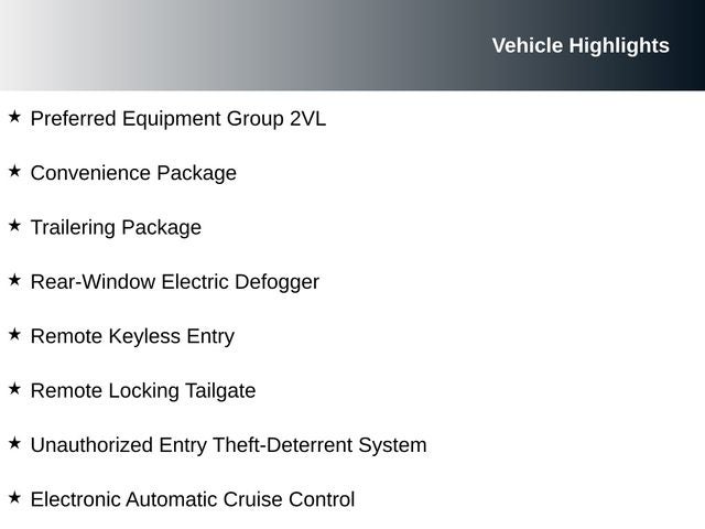 Automatic Locking Rear Differential, Convenience Package, Electronic Automatic Cruise Control, EZ-Lift & Lower Tailgate, Front Bucket Seats, Preferred Equipment Group 2VL, Rear-Window Electric Defogger, Remote Keyless Entry, Remote Locking Tailgate, Trailering Package, Unauthorized Entry Theft-Deterrent System, Wheels: 16 x 7 Ultra Silver Metallic.