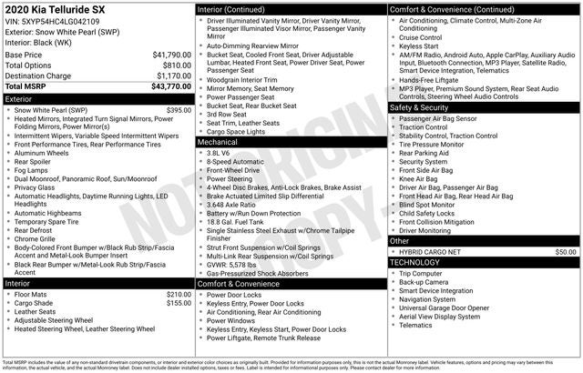 Powered by a robust 3.8L V6 DGI DOHC Dual CVVT engine, the Telluride SX delivers an exceptional driving experience with its smooth and responsive 8-Speed Automatic transmission. With an impressive fuel efficiency of 20 MPG in the city and 26 MPG on the highway, this SUV offers the perfect balance of power and efficiency to meet your diverse needs.