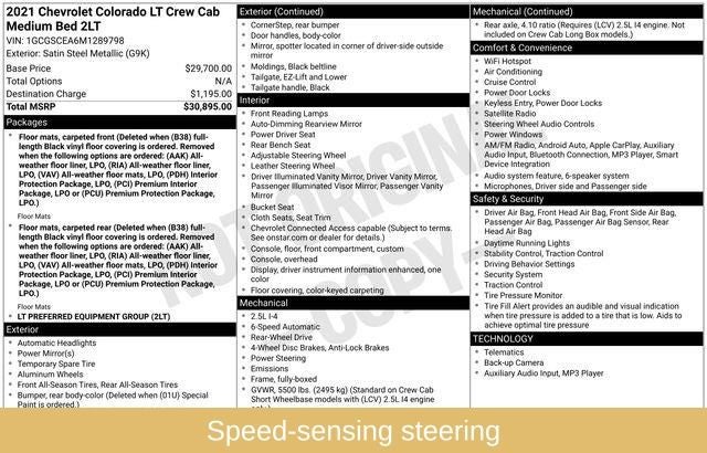 The Colorado LT's Preferred Equipment Group 2LT further enhances your driving experience with a host of premium amenities. Indulge in the comfort of the power driver's seat, the warmth of the illuminated entry, and the precision of the speed-sensing steering. With the Enhanced Driver Instrument Information Display, you'll always have the vital information you need at your fingertips.