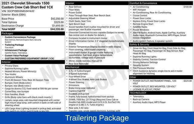 Black 2021 Chevrolet Silverado 1500 Custom 4WD 8-Speed Automatic 2.7L Turbo WE DELIVER ANYWHERE, Ford Blue Advantage Blue Certified Certified, 8-Speed Automatic, 4WD, Black Cloth, 170 Amp Alternator, 3.5 Diagonal Monochromatic Display, Bluetooth® For Phone, Body Color Grille, Color-Keyed Carpeting Floor Covering, Compass, Custom Convenience Package, Custom Value Package, Deep-Tinted Glass, Electric Rear-Window Defogger, Electronic Cruise Control, EZ Lift Power Lock & Release Tailgate, Front Frame-Mounted Black Recovery Hooks, Front Rubberized Vinyl Floor Mats, Infotainment Package, LED Cargo Area Lighting, Manual Tilt Wheel Steering Column, Power Door Locks, Power Front Windows w/Driver Express Up/Down, Power Front Windows w/Passenger Express Down, Power Rear Windows w/Express Down, Preferred Equipment Group 1CX, Rear 60/40 Folding Bench Seat (Folds Up), Rear Rubberized-Vinyl Floor Mats, Remote Keyless Entry, Remote Vehicle Starter System, Standard Tailgate, Trailering Package, 120-Volt Bed Mounted Power Outlet, 120-Volt Instrument Panel Power Outlet, 3.42 Rear Axle Ratio, 4-Wheel Disc Brakes, 40/20/40 Front Split Bench Seat, 4G LTE Wi-Fi Hot Spot Capable, 6 Speakers, ABS brakes, Air Conditioning, Alloy wheels, AM/FM radio: SiriusXM, Apple CarPlay/Android Auto, Brake assist, Bumpers: body-color, Chevrolet Connected Access Capable, Cloth Seat Trim, Delay-off headlights, Driver door bin, Driver vanity mirror, Dual front impact airbags, Dual front side impact airbags, Electronic Stability Control, Front anti-roll bar, Front Center Armrest w/Storage, Front License Plate Kit, Front reading lights, Front wheel independent suspension, Fully automatic headlights, Heated door mirrors, Heavy Duty Suspension, Hitch Guidance, Illuminated entry, Low tire pressure warning, Occupant sensing airbag, OnStar & Chevrolet Connected Services Capable, Outside temperature display, Overhead airbag, Overhead console, Panic alarm, Passenger door bin, Passenger vanity mirror, Polished Exhaust Tip, Power door mirrors, Power steering, Power windows, Premium audio system: Chevrolet Infotainment 3, Radio data system, Radio: Chevrolet Infotainment 3 System, Rear reading lights, Rear step bumper, Rear window defroster, Remote keyless entry, Security system, Single-Zone Manual/Semi-Automatic Air Conditioning, SiriusXM Radio, Speed control, Speed-sensing steering, Split folding rear seat, Tachometer, Theft Deterrent System (Unauthorized Entry), Tilt steering wheel, Traction control, Trip computer, Variably intermittent wipers, Voltmeter, Wheels: 20 x 9 Bright Silver Painted Aluminum, 8-Speed Automatic, 4WD, Black Cloth, 170 Amp Alternator, 3.5 Diagonal Monochromatic Display, Bluetooth® For Phone, Body Color Grille, Color-Keyed Carpeting Floor Covering, Compass, Custom Convenience Package, Custom Value Package, Deep-Tinted Glass, Electric Rear-Window Defogger, Electronic Cruise Control, EZ Lift Power Lock & Release Tailgate, Front Frame-Mounted Black Recovery Hooks, Front Rubberized Vinyl Floor Mats, Infotainment Package, LED Cargo Area Lighting, Manual Tilt Wheel Steering Column, Power Door Locks, Power Front Windows w/Driver Express Up/Down, Power Front Windows w/Passenger Express Down, Power Rear Windows w/Express Down, Preferred Equipment Group 1CX, Rear 60/40 Folding Bench Seat (Folds Up), Rear Rubberized-Vinyl Floor Mats, Remote Keyless Entry, Remote Vehicle Starter System, Standard Tailgate, Trailering Pa