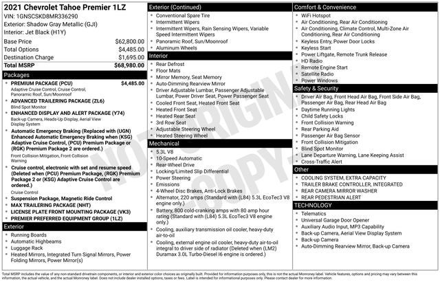 Whether you're transporting your family in comfort and style or tackling your next outdoor adventure, this 2021 Chevrolet Tahoe Premier is the perfect companion. With its exceptional capabilities, premium amenities, and striking good looks, this Tahoe is sure to impress. We invite you to come in and experience it for yourself. Let us show you why this Tahoe Premier is the perfect fit for your lifestyle.