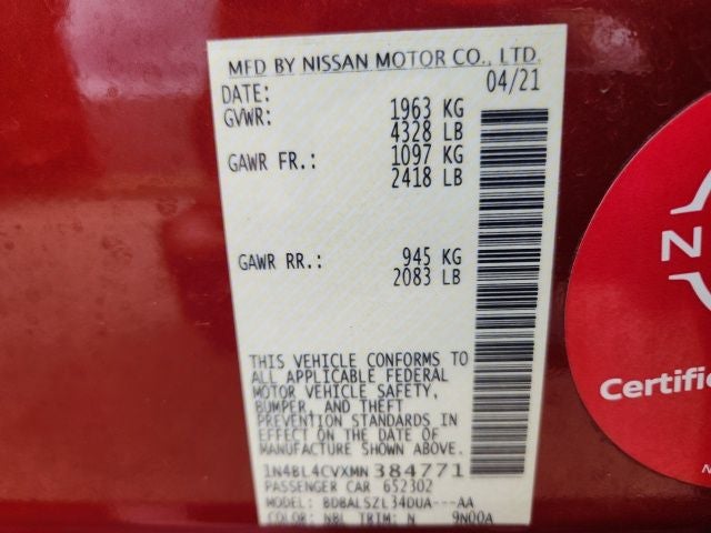 Scarlet Ember Tintcoat 2021 Nissan Altima 2.5 SR FWD CVT with Xtronic 2.5L 4-Cylinder DOHC 16V CVT with Xtronic, NissanConnect featuring Apple CarPlay and Android Auto, 19 Alloy Wheels, 4-Wheel Disc Brakes, 6 Speakers, ABS brakes, Air Conditioning, Alloy wheels, AM/FM radio: SiriusXM, Auto High-beam Headlights, Blind Spot Warning, Body-Colored Splash Guards, Brake assist, Bumpers: body-color, Chrome Bumper Protector, Delay-off headlights, Driver door bin, Driver vanity mirror, Dual front impact airbags, Dual front side impact airbags, Electronic Stability Control, Four wheel independent suspension, Front anti-roll bar, Front Bucket Seats, Front Center Armrest, Front reading lights, Front Sport Bucket Seats, Fully automatic headlights, Illuminated entry, Knee airbag, Leather Shift Knob, Low tire pressure warning, Occupant sensing airbag, Outside temperature display, Overhead airbag, Overhead console, Panic alarm, Passenger door bin, Passenger vanity mirror, Power door mirrors, Power driver seat, Power steering, Power windows, Radio data system, Radio: AM/FM Audio System, Rear anti-roll bar, Rear Parking Sensors, Rear reading lights, Rear seat center armrest, Rear side impact airbag, Rear window defroster, Remote keyless entry, Security system, Speed control, Speed-sensing steering, Speed-Sensitive Wipers, Split folding rear seat, Sport Seat Trim, Sport steering wheel, SR Floor Mats/Trunk Mat/Hideaway Nets, Steering wheel mounted audio controls, Tachometer, Telescoping steering wheel, Tilt steering wheel, Traction control, Trip computer, Trunk Organizer Tray, Variably intermittent wipers, CVT with Xtronic, NissanConnect featuring Apple CarPlay and Android Auto.