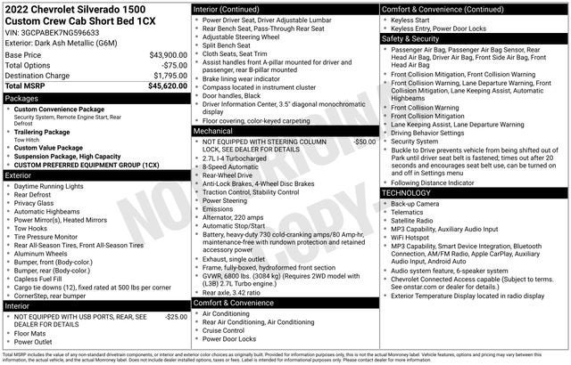 10-Way Power Driver Seat w/Lumbar, 120-Volt Bed Mounted Power Outlet, 120-Volt Instrument Panel Power Outlet, 3.42 Rear Axle Ratio, 3.5 Monochromatic Display Driver Info Center, 4-Wheel Disc Brakes, 40/20/40 Front Split-Bench Seat, 6 Speakers, 6-Speaker Audio System, ABS brakes, Air Conditioning, Alloy wheels, AM/FM radio: SiriusXM, Apple CarPlay/Android Auto, Auto High-beam Headlights, Automatic Emergency Braking, Bluetooth® For Phone, Brake assist, Bumpers: body-color, Chevrolet Connected Access Capable, Cloth Seat Trim, Color-Keyed Carpeting Floor Covering, Compass, Custom Convenience Package, Custom Value Package, Deep-Tinted Glass, Delay-off headlights, Driver door bin, Driver vanity mirror, Dual front impact airbags, Dual front side impact airbags, Dual Rear USB Ports (Charge Only), Electric Rear-Window Defogger, Electrical Steering Column Lock, Electronic Cruise Control, Electronic Stability Control, EZ Lift Power Lock & Release Tailgate, Following Distance Indicator, Forward Collision Alert, Front anti-roll bar, Front Center Armrest w/Storage, Front Frame-Mounted Black Recovery Hooks, Front Pedestrian Braking, Front reading lights, Front Rubberized Vinyl Floor Mats, Front wheel independent suspension, Fully automatic headlights, HD Rear Vision Camera, Heated door mirrors, High Capacity Suspension Package, Hitch Guidance, Illuminated entry, IntelliBeam Automatic High Beam On/Off, Lane Keep Assist w/Lane Departure Warning, LED Cargo Area Lighting, Low tire pressure warning, Manual Tilt Wheel Steering Column, Not Equipped w/Rear USB Ports, Not Equipped w/Steering Column Lock, Occupant sensing airbag, OnStar & Chevrolet Connected Services Capable, Outside temperature display, Overhead airbag, Overhead console, Panic alarm, Passenger door bin, Passenger vanity mirror, Power door mirrors, Power driver seat, Power Front Windows w/Driver Express Up/Down, Power Front Windows w/Passenger Express Down, Power Rear Windows w/Express Down, Power steering, Power windows, Preferred Equipment Group 1CX, Premium audio system: Chevrolet Infotainment 3, Radio data system, Radio: Chevrolet Infotainment 3 System, Rear 60/40 Folding Bench Seat (Folds Up), Rear reading lights, Rear Rubberized-Vinyl Floor Mats, Rear step bumper, Rear window defroster, Remote Keyless Entry, Remote keyless entry, Remote Vehicle Starter System, Security system, SiriusXM Radio, Speed control, Speed-sensing steering, Split folding rear seat, Standard Tailgate, Tachometer, Theft Deterrent System (Unauthorized Entry), Tilt steering wheel, Traction control, Trailering Package, Trip computer, Variably intermittent wipers, Voltmeter, Wheels: 20 x 9 Bright Silver Painted Aluminum, Wi-Fi Hot Spot Capable, Wireless Phone Projection.