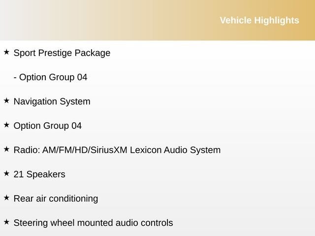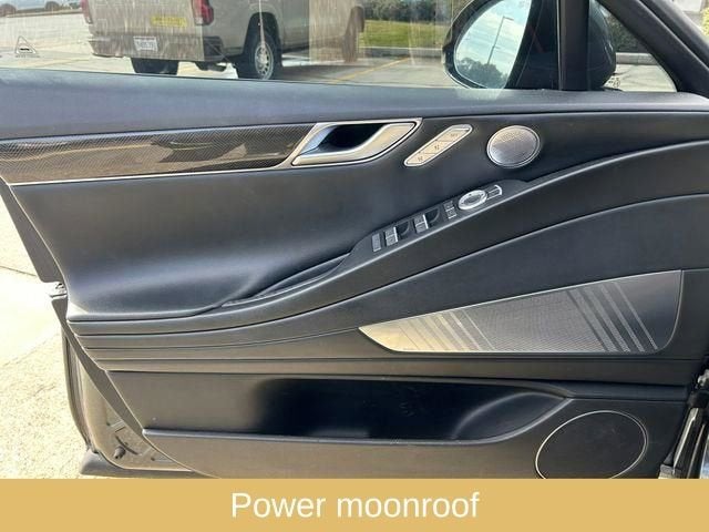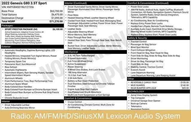 21 Speakers, Adaptive suspension, Android Auto & Apple CarPlay, Electronic Stability Control, Exterior Parking Camera Rear, Forward Collision-Avoidance Assist, Four wheel independent suspension, Heated & Ventilated Front Bucket Seats, Heated front seats, Heated rear seats, Leather Seating Surfaces, Navigation System, Option Group 04, Power driver seat, Power moonroof, Power passenger seat, Radio: AM/FM/HD/SiriusXM Lexicon Audio System, Rain sensing wipers, Rear air conditioning, Rear Window Blind, Speed-sensing steering, Sport Prestige Package, Steering wheel memory, Steering wheel mounted audio controls, Wheels: 19x8.5J Fr & 19x9.5J Rr Alloy, 4-Wheel Disc Brakes, ABS brakes, Air Conditioning, Alloy wheels, AM/FM radio: SiriusXM, Anti-whiplash front head restraints, Auto High-beam Headlights, Auto tilt-away steering wheel, Auto-dimming door mirrors, Auto-dimming Rear-View mirror, Automatic temperature control, Bumpers: body-color, Compass, Delay-off headlights, Driver door bin, Driver vanity mirror, Dual front impact airbags, Dual front side impact airbags, Emergency communication system: Genesis Connected Services, Front anti-roll bar, Front Bucket Seats, Front Center Armrest, Front dual zone A/C, Front reading lights, Fully automatic headlights, Garage door transmitter: HomeLink, Heated door mirrors, Heated steering wheel, Highway Driving Assist, Illuminated entry, Knee airbag, Leather steering wheel, Low tire pressure warning, Memory seat, Mud Guards, Occupant sensing airbag, Outside temperature display, Overhead airbag, Overhead console, Panic alarm, Passenger door bin, Passenger vanity mirror, Power door mirrors, Power steering, Power windows, Radio data system, Rear anti-roll bar, Rear Bumper Applique, Rear reading lights, Rear seat center armrest, Rear side impact airbag, Rear window defroster, Remote keyless entry, Reversible Cargo Tray, Security system, Speed control, Speed-Sensitive Wipers, Tachometer, Telescoping steering wheel, Tilt steering wheel, Traction control, Trip computer, Turn signal indicator mirrors, Variably intermittent wipers, Ventilated front seats, 21 Speakers, Adaptive suspension, Android Auto & Apple CarPlay, Electronic Stability Control, Exterior Parking Camera Rear, Forward Collision-Avoidance Assist, Four wheel independent suspension, Heated & Ventilated Front Bucket Seats, Heated front seats, Heated rear seats, Leather Seating Surfaces, Navigation System, Option Group 04, Power driver seat, Power moonroof, Power passenger seat, Radio: AM/FM/HD/SiriusXM Lexicon Audio System, Rain sensing wipers, Rear air conditioning, Rear Window Blind, Speed-sensing steering, Sport Prestige Package, Steering wheel memory, Steering wheel mounted audio controls, Wheels: 19x8.5J Fr & 19x9.5J Rr Alloy.