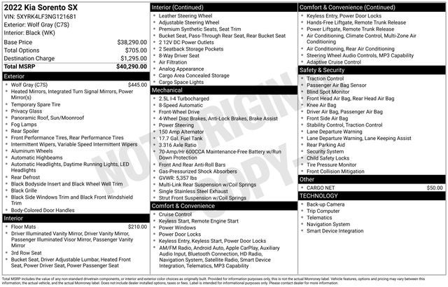 CARFAX One-Owner. Clean CARFAX. Wolf Gray 2022 Kia Sorento SX FWD 8-Speed DCT 2.5L I4 DGI Turbocharged DOHC 16V LEV3-ULEV70 281hp 3.316 Axle Ratio, 3rd row seats: split-bench, 4-Wheel Disc Brakes, 6 Speakers, ABS brakes, Air Conditioning, Alloy wheels, AM/FM radio: SiriusXM, Apple CarPlay & Android Auto, Auto High-beam Headlights, Automatic temperature control, Brake assist, Bumpers: body-color, Cargo Net, Carpeted Floor Mats, Delay-off headlights, Driver door bin, Driver vanity mirror, Dual front impact airbags, Dual front side impact airbags, Electronic Stability Control, Emergency communication system: UVO Link, Exterior Parking Camera Rear, Four wheel independent suspension, Front anti-roll bar, Front Bucket Seats, Front Center Armrest, Front dual zone A/C, Front fog lights, Front reading lights, Fully automatic headlights, Heated door mirrors, Heated Front Bucket Seats, Heated front seats, Illuminated entry, Knee airbag, Leather steering wheel, Low tire pressure warning, Navigation System, Occupant sensing airbag, Outside temperature display, Overhead airbag, Overhead console, Panic alarm, Passenger door bin, Passenger vanity mirror, Power door mirrors, Power driver seat, Power Liftgate, Power moonroof, Power passenger seat, Power steering, Power windows, Radio data system, Radio: AM/FM Audio System, Rear air conditioning, Rear anti-roll bar, Rear reading lights, Rear window defroster, Rear window wiper, Remote keyless entry, Roof rack: rails only, Security system, Smart Key w/ Push Button and Remote Start, Speed control, Speed-sensing steering, Split folding rear seat, Spoiler, Steering wheel mounted audio controls, SynTex Artificial Leather Seat Trim, Tachometer, Telescoping steering wheel, Tilt steering wheel, Traction control, Trip computer, Turn signal indicator mirrors, Variably intermittent wipers, Wheels: 8.5J x 20 Gloss Black Alloy.