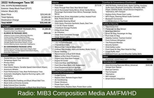 6 Speakers, Active Blind Spot Monitor, Adaptive Cruise Control (ACC) w/Stop & Go, Alloy wheels, AM/FM radio: SiriusXM with 360L, Automatic Rain-Sensing Front Wipers, Emergency Assist, Emergency communication system: Car-Net, Exterior Parking Camera Rear, Fully automatic headlights, Hands-On Detection Sensor Steering Wheel, Heated door mirrors, Heated Front Comfort Seats, Heated Steering Wheel, Illuminated entry, IQ.DRIVE SE Package, Lane Assist (Lane Keeping System), Leather Shift Knob, Panic alarm, Panoramic Sunroof Package, Radio: MIB3 Composition Media AM/FM/HD, Rear Traffic Alert, Remote keyless entry, SE Convenience Package, Security system, Steering wheel mounted audio controls, Travel Assist (Semi-Automated Driving Assistance), Wheels: 18 2-Tone Machined Alloy.