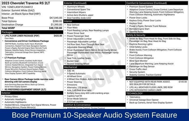 - LT Premium Package includes (IOU) Chevrolet Infotainment 3 Plus system with connected Navigation and 8" diagonal HD color touchscreen, (UQA) Bose premium 10-speaker system, (DRZ) Rear Camera Mirror Package, (UV2) HD Surround Vision, (KSG) Adaptive Cruise Control, (UGN) Enhanced Automatic Emergency Braking, (UKK) Rear Pedestrian Alert, (DBT) Outside heated power-folding body-color mirrors with turn signal indicators and (KI6) 120-volt power outlet