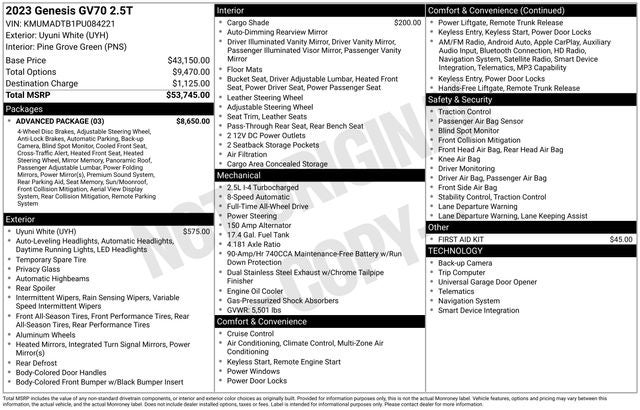 - Radio: AM/FM/SiriusXM/HD Premium Audio System -inc: navigation system, 9 speakers, internal amplifier, 14.5" HD display screen, Apple CarPlay and Android Auto, Bluetooth® hands-free phone system w/audio streaming, 4 USB ports and Genesis Connected Services