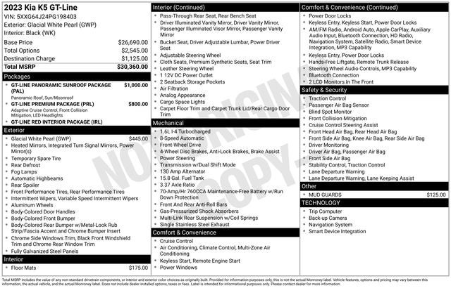 CARFAX One-Owner. Glacial White Pearl 2023 Kia K5 GT-Line FWD 8-Speed Automatic 1.6L I4 DGI Turbocharged DOHC 16V LEV3-ULEV70 180hp 4-Wheel Disc Brakes, 6 Speakers, ABS brakes, Air Conditioning, Alloy wheels, AM/FM radio: SiriusXM, Apple CarPlay & Android Auto, Auto High-beam Headlights, Automatic temperature control, Brake assist, Bumpers: body-color, Carpeted Floor Mats, Cloth/SynTex Seat Trim, Delay-off headlights, Driver door bin, Driver vanity mirror, Dual front impact airbags, Dual front side impact airbags, Electronic Stability Control, Forward Collision Avoidance-Assist, Four wheel independent suspension, Front anti-roll bar, Front Bucket Seats, Front Center Armrest, Front dual zone A/C, Front fog lights, Front reading lights, Fully automatic headlights, GT-Line Panoramic Sunroof Package, GT-Line Premium Package, GT-Line Red Interior Package, Heated door mirrors, Highway Driving Assist, Illuminated entry, Knee airbag, LED Interior Lighting, LED Projection Headlamps, Low tire pressure warning, Mud Guards, Navigation System, Occupant sensing airbag, Outside temperature display, Overhead airbag, Overhead console, Panic alarm, Panoramic Sunroof, Passenger door bin, Passenger vanity mirror, Power door mirrors, Power driver seat, Power steering, Power windows, Radio data system, Radio: AM/FM/MP3 Audio System, Rear anti-roll bar, Rear seat center armrest, Rear side impact airbag, Rear window defroster, Remote keyless entry, Security system, Smart Cruise Control w/Stop & Go, Speed control, Speed-sensing steering, Split folding rear seat, Spoiler, Sport steering wheel, Steering wheel mounted audio controls, Tachometer, Telescoping steering wheel, Tilt steering wheel, Traction control, Trip computer, Turn signal indicator mirrors, Variably intermittent wipers, Wheels: 18 Gloss Black Machined Finish Alloy.