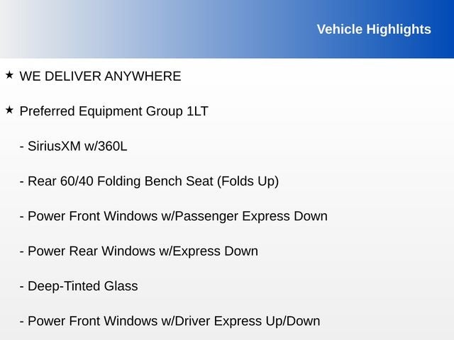 - SiriusXM with 360L includes a trial subscription to the Platinum Plan. Experience more channels in the vehicle, a more personalized experience and easier navigation (IMPORTANT: The SiriusXM trial package is not provided on vehicles that are ordered for Fleet Daily Rental ("FDR") use. Trial subscription subject to the SiriusXM Customer Agreement and privacy policy, visit www.siriusxm.com which includes full terms and how to cancel. All fees, content, features, and availability are subject to change. Some features require GM connected vehicle services.)
