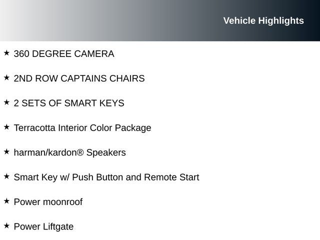 Stepping inside, you'll be captivated by the premium Terracotta interior, which exudes sophistication and refinement. The spacious cabin, complete with 3rd-row seating, provides ample room for your family and friends to enjoy the journey. Indulge in the convenience of the Power Liftgate, the safety of the 360 Degree Camera, and the exceptional audio experience of the harman/kardon® sound system.