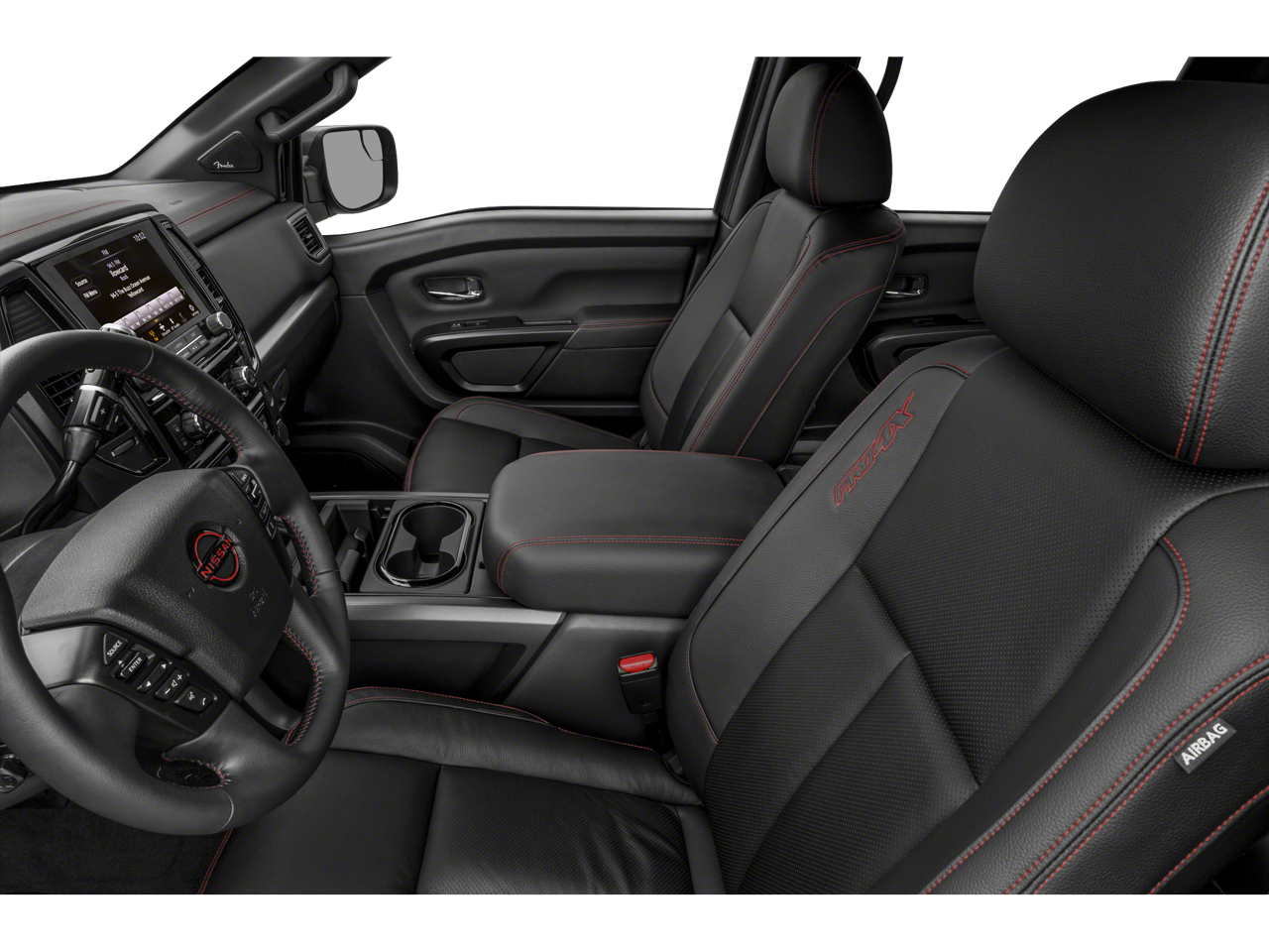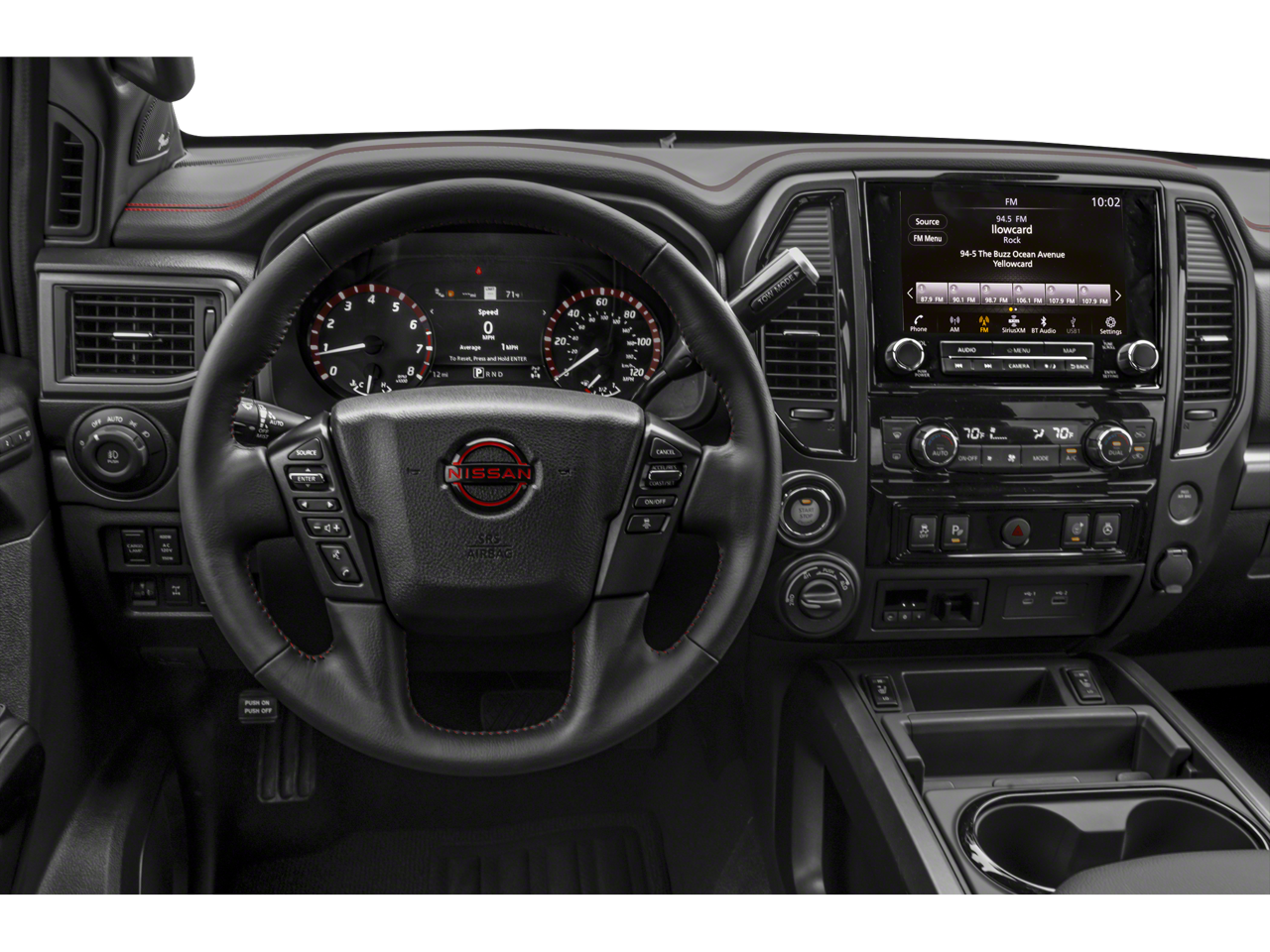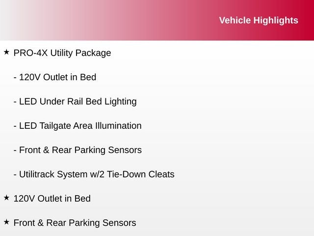 3.692 Axle Ratio, 4-Wheel Disc Brakes, 6 Speakers, ABS brakes, Air Conditioning, Alloy wheels, AM/FM radio: SiriusXM, Apple CarPlay/Android Auto, Auto High-beam Headlights, Auto-dimming Rear-View mirror, Auto-leveling suspension, Automatic temperature control, Bed Assist Grip, Blind Spot Warning, Brake assist, Cloth Seat Trim w/Vinyl Bolsters, Compass, Delay-off headlights, Driver door bin, Driver vanity mirror, Dual front impact airbags, Dual front side impact airbags, Electronic Stability Control, Emergency communication system: NissanConnect Services, Front anti-roll bar, Front Bucket Seats, Front Captain's Seats, Front Center Armrest, Front dual zone A/C, Front fog lights, Front reading lights, Front wheel independent suspension, Fully automatic headlights, Garage door transmitter: HomeLink, Heated door mirrors, Illuminated entry, Knee airbag, Leather steering wheel, Low tire pressure warning, Navigation system: NissanConnect with Navigation and Services, Occupant sensing airbag, Outside temperature display, Overhead airbag, Overhead console, Panic alarm, Passenger door bin, Passenger vanity mirror, Power door mirrors, Power driver seat, Power steering, Power windows, PRO-4X Badged Floor Mats, PRO-4X Illuminated Kick Plate, PRO-4X Mud Flaps, PRO-4X Rugged Step Boards, PRO-4X Utility Package, Radio data system, Radio: NissanConnect w/Navigation, Rain sensing wipers, Rear anti-roll bar, Rear Bumper Step w/Electronic Tailgate Lock, Rear Parking Sensors, Rear reading lights, Rear seat center armrest, Rear step bumper, Rear Underseat Storage, Rear window defroster, Remote keyless entry, Security system, Speed control, Speed-sensing steering, Speed-Sensitive Wipers, Split folding rear seat, Steering wheel mounted audio controls, Tachometer, Telescoping steering wheel, Tilt steering wheel, Traction control, Trip computer, USB Charging Cables, Variably intermittent wipers, Voltmeter, Wheels: 18 x 8 Painted Dark Finish Alloy.