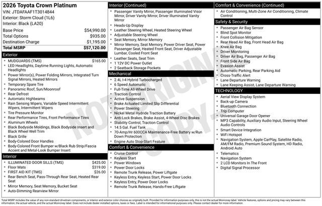 Powered by a 2.4L 4-Cylinder DOHC engine paired with a 6-Speed Automatic transmission and All-Wheel Drive, the Crown Platinum offers an exceptional blend of performance and efficiency, with an EPA-estimated 29 MPG in the city and 32 MPG on the highway.